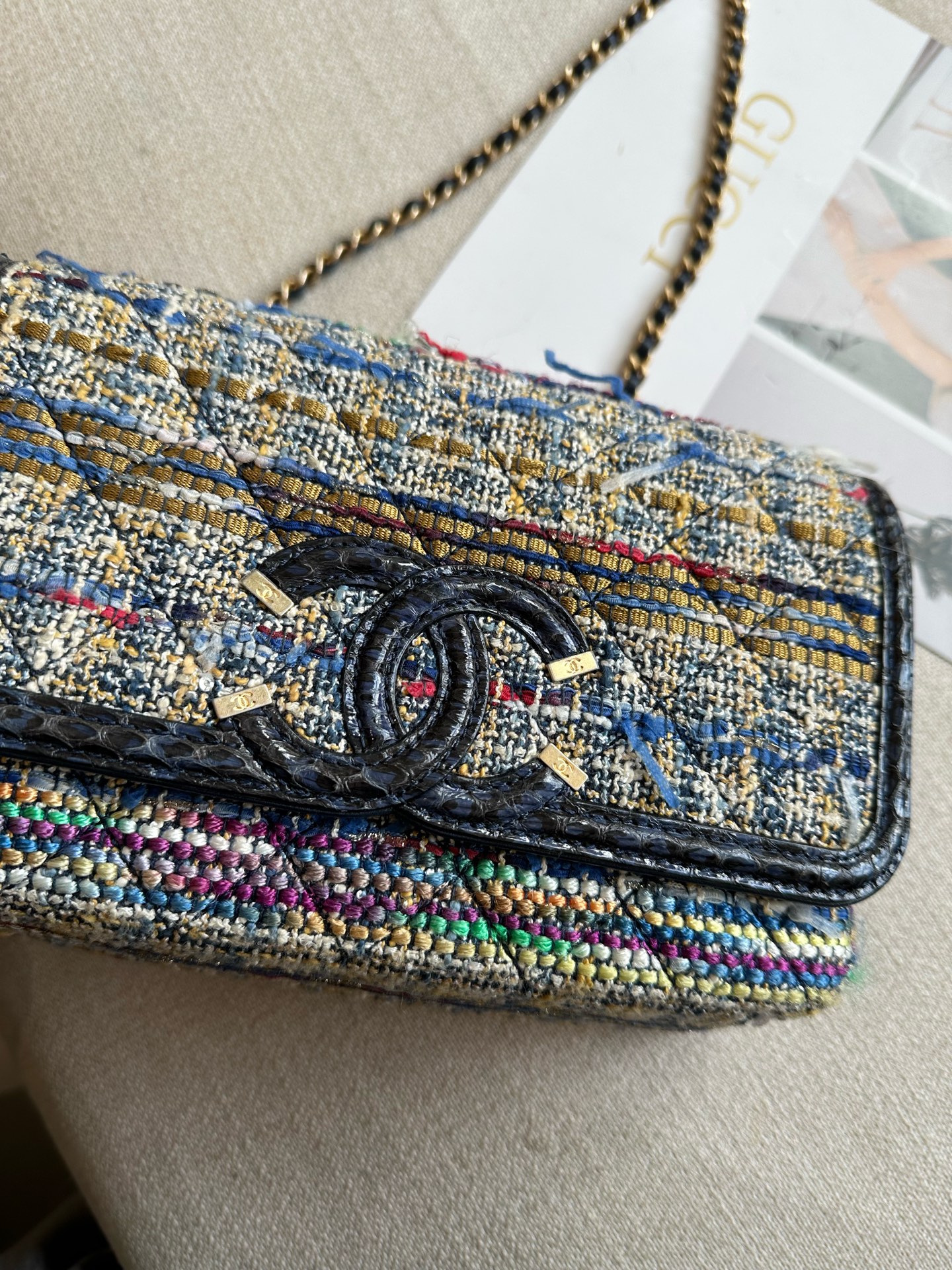 Chanel Rainbow Tweed Blue Snakeskin Crossbody Bag